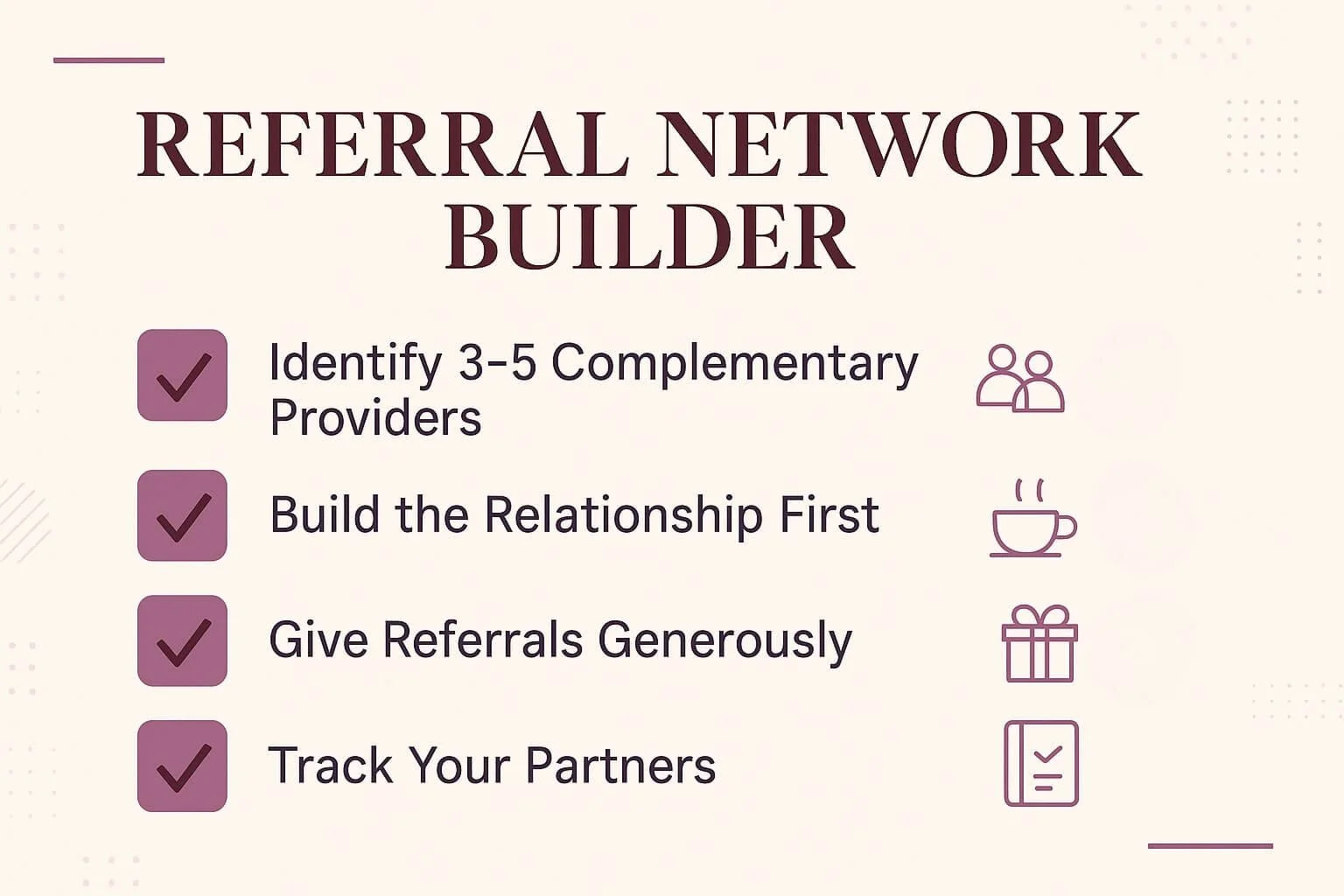 Big reminder: The goal here is to build trust and alignment before you ever talk about referrals. In my programs, I call this value-first networking, because it’s the only kind that works long-term.